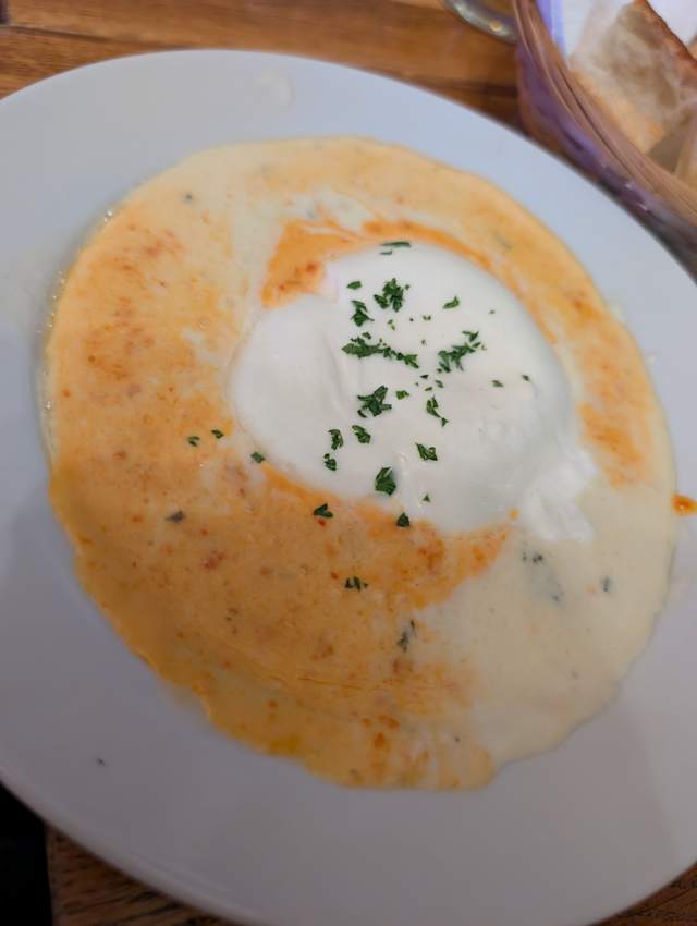 - Oeuf mollet a la creme fromagere & aux oignons frits