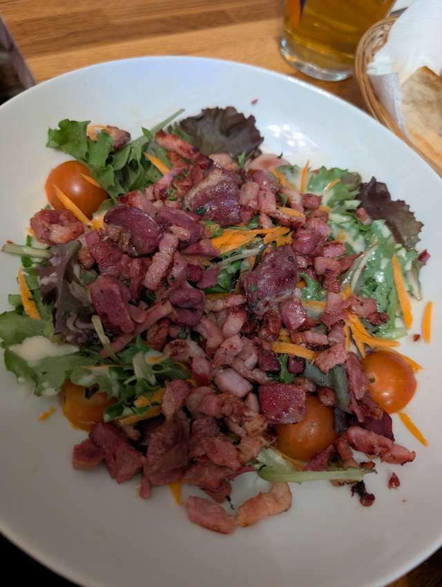 - (Lardons, gésiers fumés, magret de canard, noix)