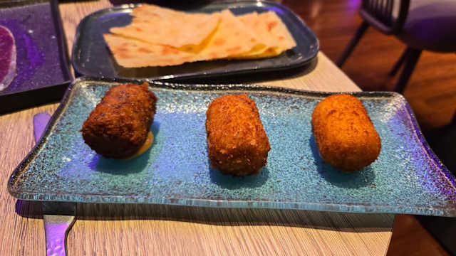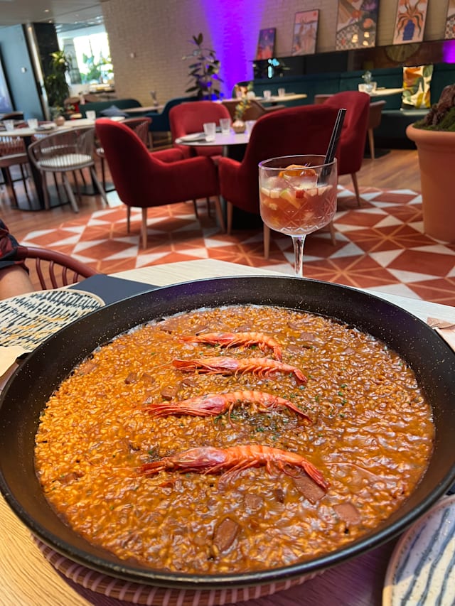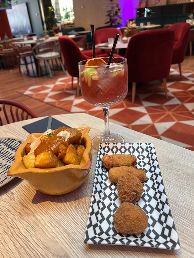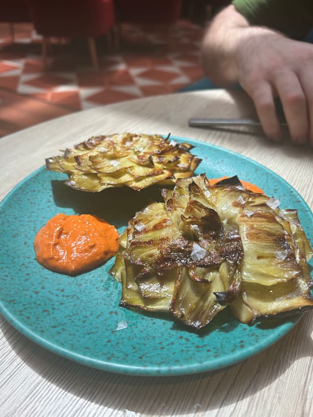 7.5/10It was as expected for a hotel restaurant. Nothing wowed us, but everything was good. There was a tv playing m-tv which seemed odd. We had The artichoke dish, the patas bravas, and the croquets. Cava, wine, and a red vermouth.