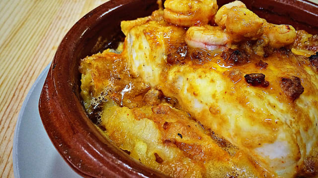 Caldero de arroz caldoso con bogavante y cigalas, cocinado a fuego lento con un fumet de marisco ´receta secreta´ que lo hacen único.