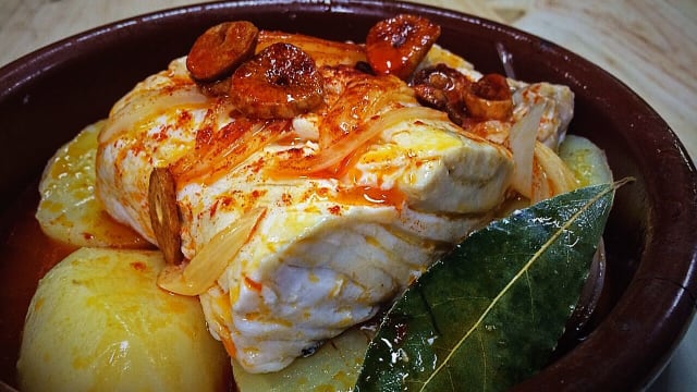 Lomo de merluza de pincho, hervido con cebolla y laurel acompañado con cachelos, aceite, pimentón y ajo