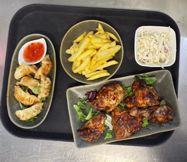 - Spare ribs, chicken and beef skewers, lamb chops. Served with salad, rice and fries