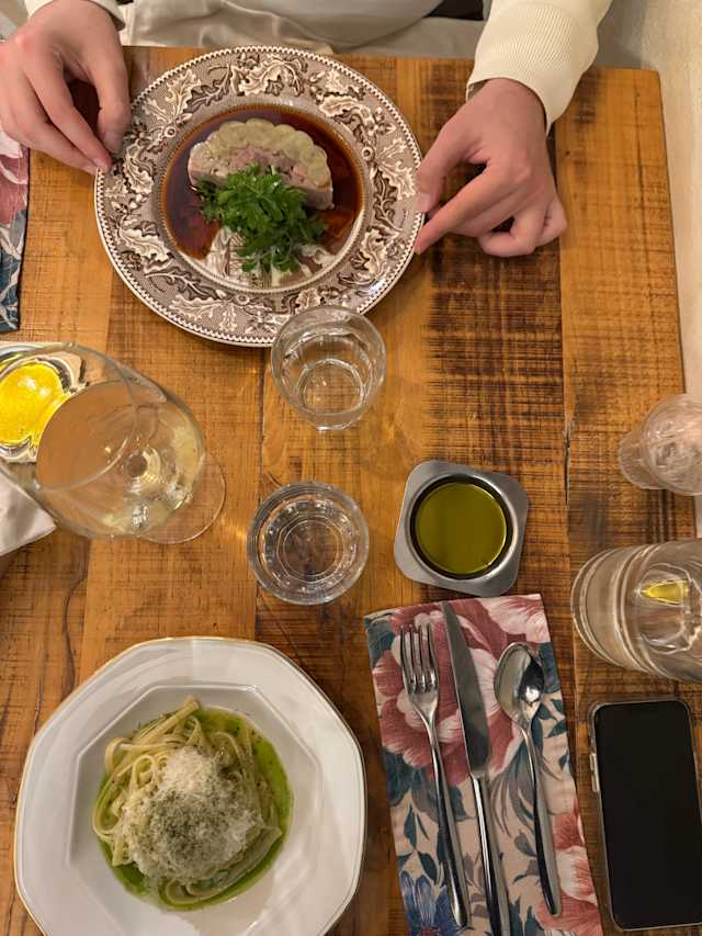 - ”Mancini” linguine, kiwi, sheep’s cheese, and basil