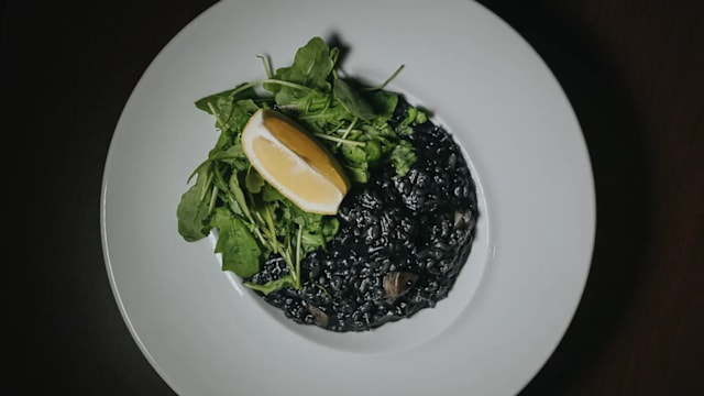 Com choco, tinta de choco e um toque de rúcula e limão.