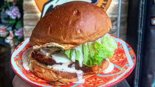 Bun americano con smashburger piccante (180 gr circa scottona), cetrioli sottaceto, insalata, monterrey jack cheese,, bacon e alabama white sauce, servito con patatine fritte