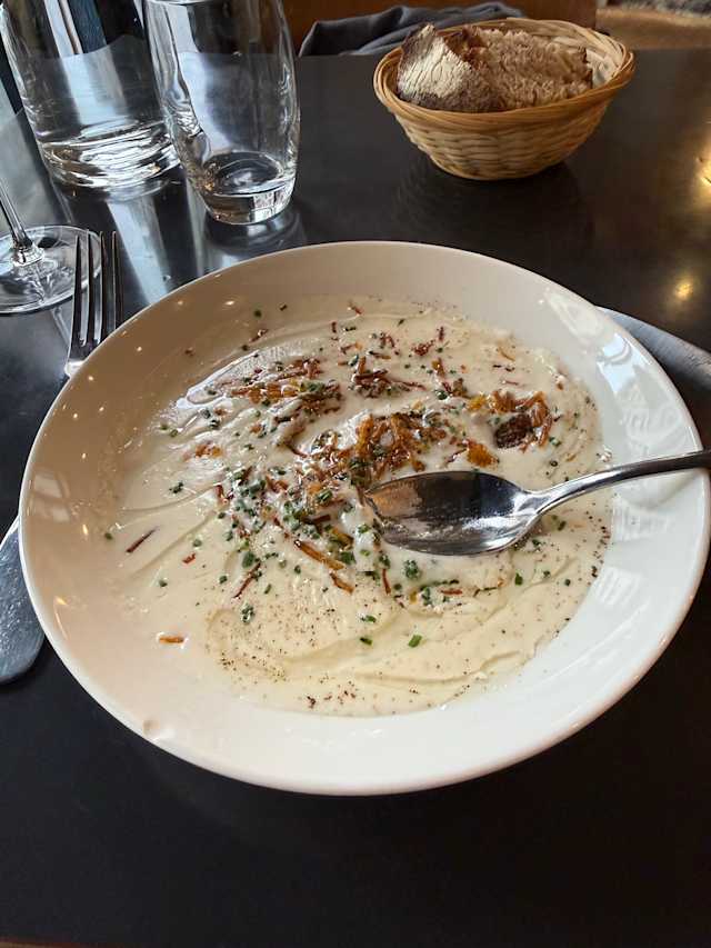 - Pêche du jour, purée de céleri rave, carottes rôties, bisque