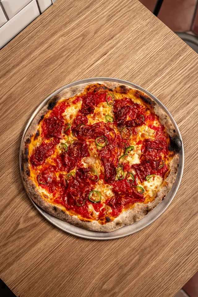 Molho de tomate, mozarela, pepperoni, queijo pecorino e orégãos.