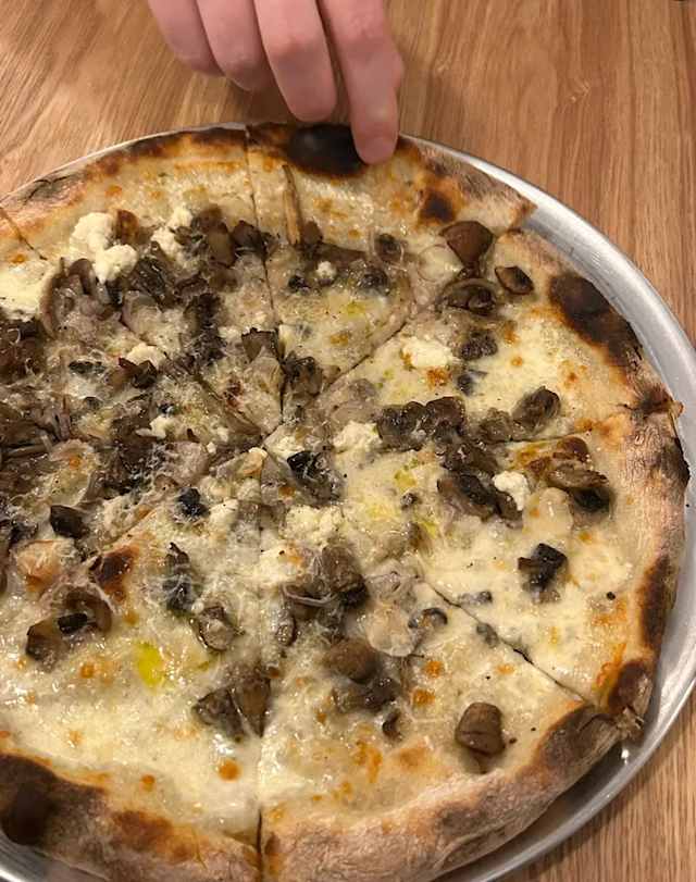 - Mozarela, cogumelos assados, chalotas, queijo burrata, alho, queijo pecorino, orégãos e azeite extra virgem.