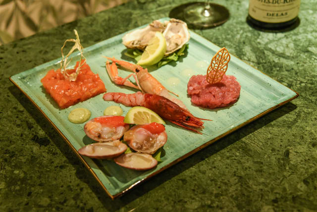Degustazione di pesce crudo del giorno, servito con olio extra vergine di oliva Dragotto - Raw Seafood Selection Daily selection of raw seafood, served with Dragotto extra virgin olive oil
