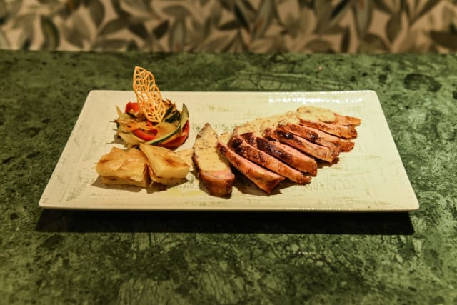 Capocollo di maiale, insalata di peperoni arrosto e la sua riduzione