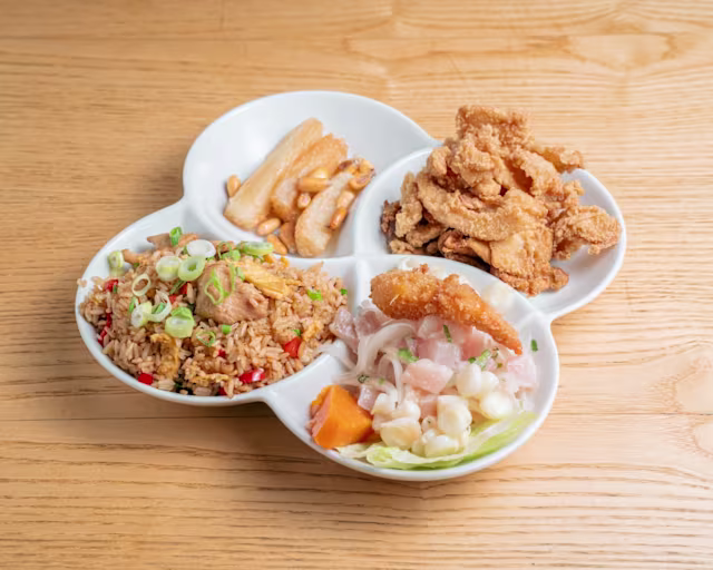 - Trío: Ceviche + chaufa + chicharrón de calamares