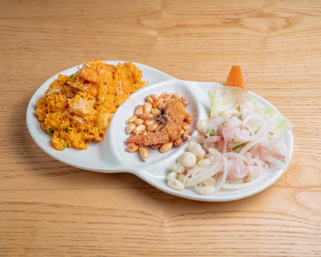 - Trío: Ceviche + arroz de mariscos + chicharrón de calamares