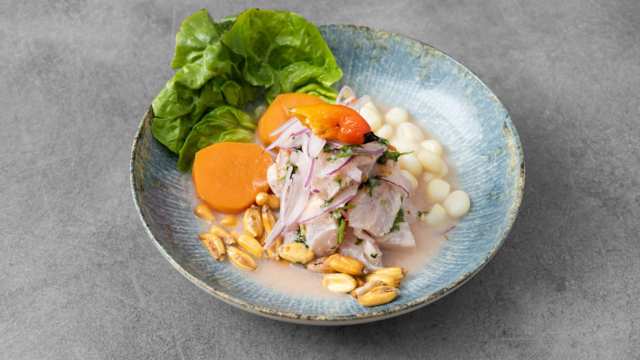 - Puré de papa con toque de ají y limón, coronado con ceviche de pescado.