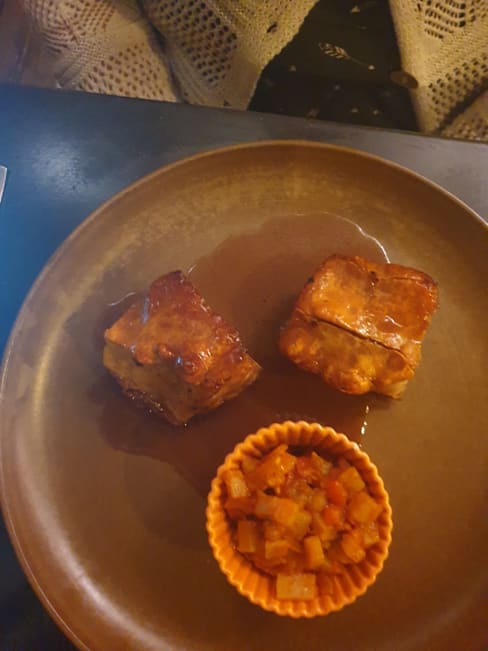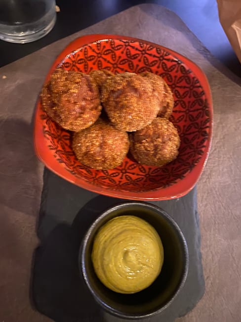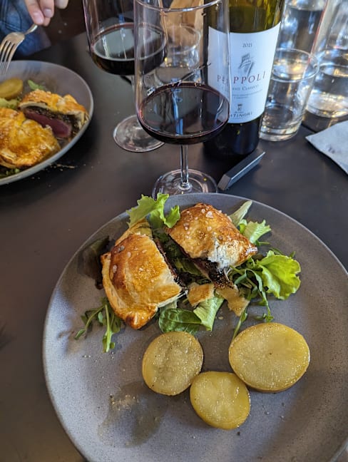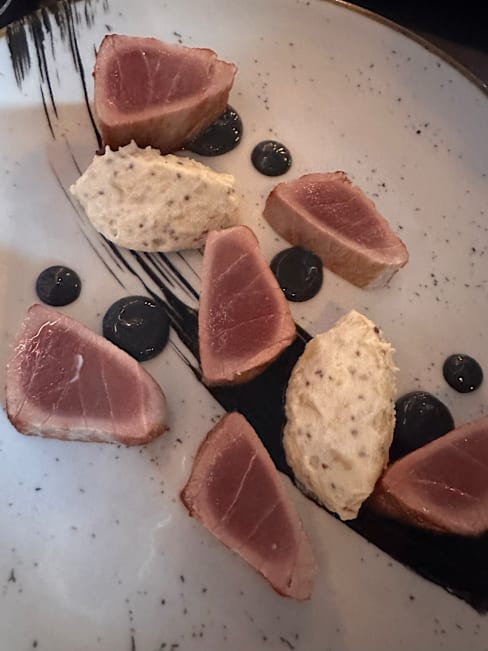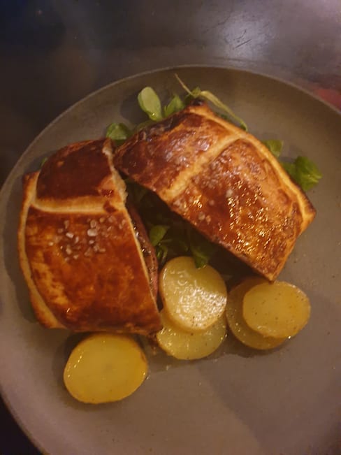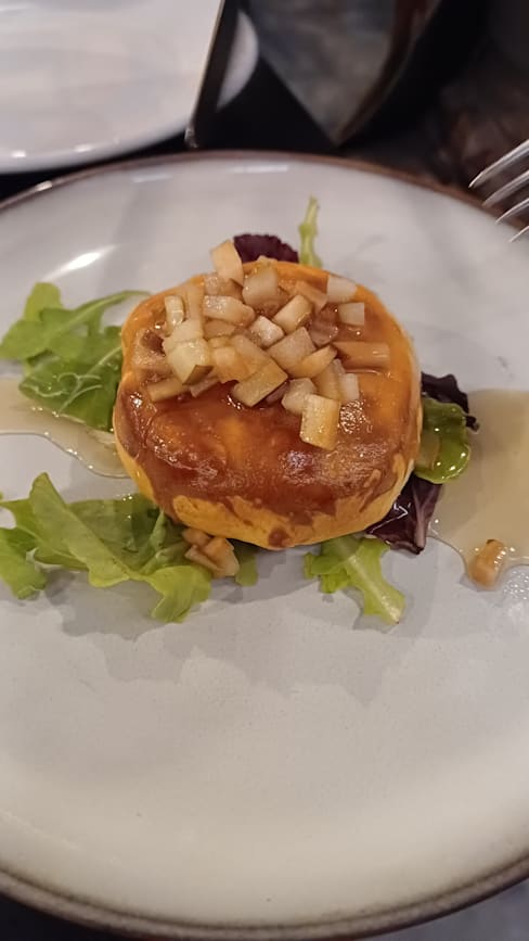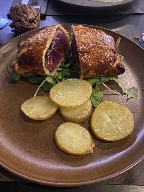 9.5/10The food was absolutely incredible, I took the chicken liver crème brulée as an appetizer and it was absolutely delicious, maybe the jam on the bread was a tad too much, but with regular bread it's delicious. The main dish was the crusted beef with truffle and figs inside, the meat was cooked to perfection and the sweetness of the crust was extremely well balanced with the big salt. For the drinks, being a real big natural wine drinker, it was a bit difficult to find the perfect bottle but the nice waiter stuck with us and eventually found what suited us best.