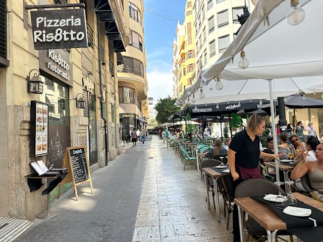 7/10We ordered a puzza and a solomillo de pork (sorry forgot de name), with a gorgonzola sauce. It tasted good and the make up of the plate was good. I mean for the kind of establishment it was ok, for sure… and so was the pizza… it was not bad at all, but ok… but… it was fukk with ingredients…. Nowadays, you can count the ham slices or mushrooms… but here… plenty of it…. I just missed that… little thing… But if you ate walking around or shopping in the center of VLC… it is a good option to crash and have some food/drinks, as it is located only 150 - 200 mts. from the Plaza de Toros Valencia and the trainstation/Station del tren VLC Nord! And as I wrote before in the kiddle of VLC center. With good weather it is good to sit outside, where you can enjoy looking at people… but if its too cold/wet to sit outside, you can sit inside as well… Staff friendly and I heard that they do speak english, for those who do not speak spanish, among us….