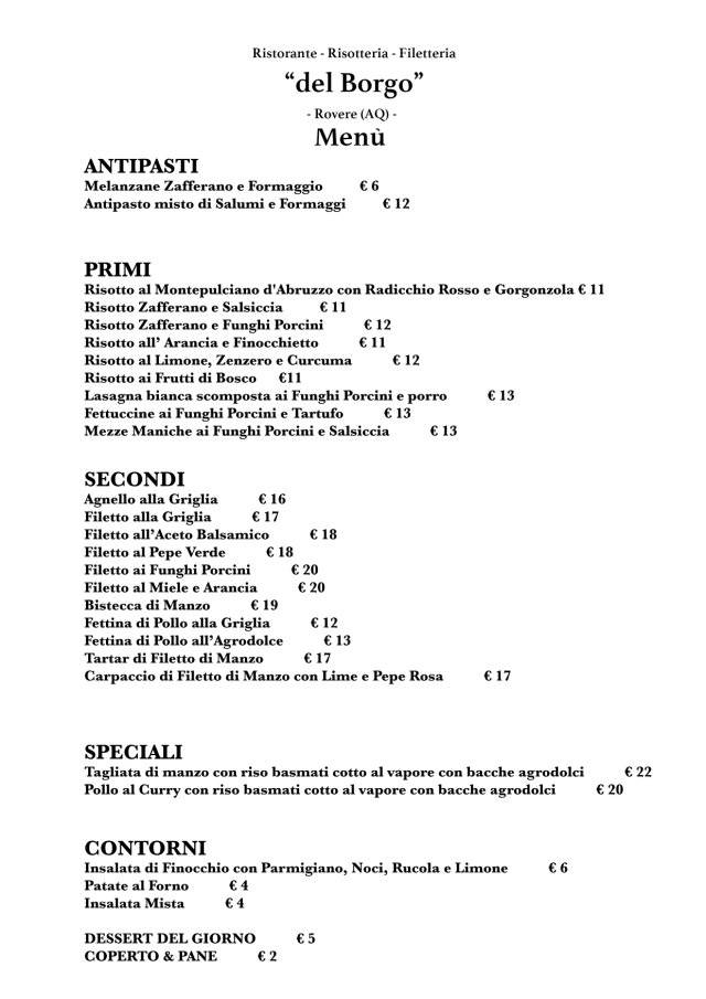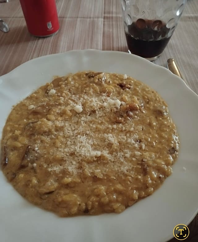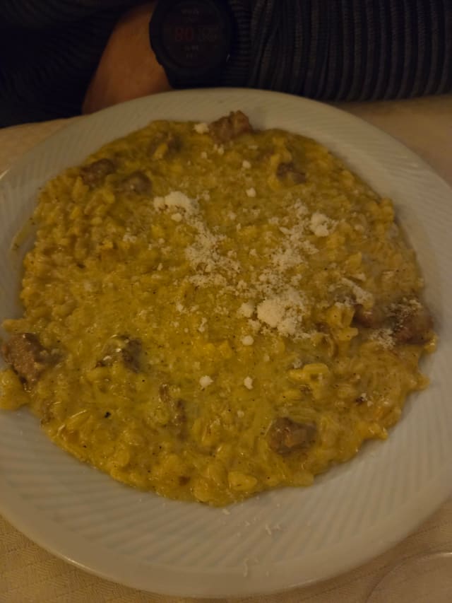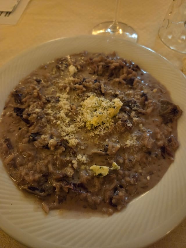 8/10The quality of the meat was very good: fat-free, soft and cooked very well. The main course "risotto" was not so special as supposed by the name of the restaurant. Dessert was not available even if on the menu. A very relaxing place to spend 3/4 hours with your family. After the lunch, you can visit the "borgo" and enjoy a wonderful view of the valley on top the hill. Unfortunately, the church on top of the hill is not accessible due to consolidation work.