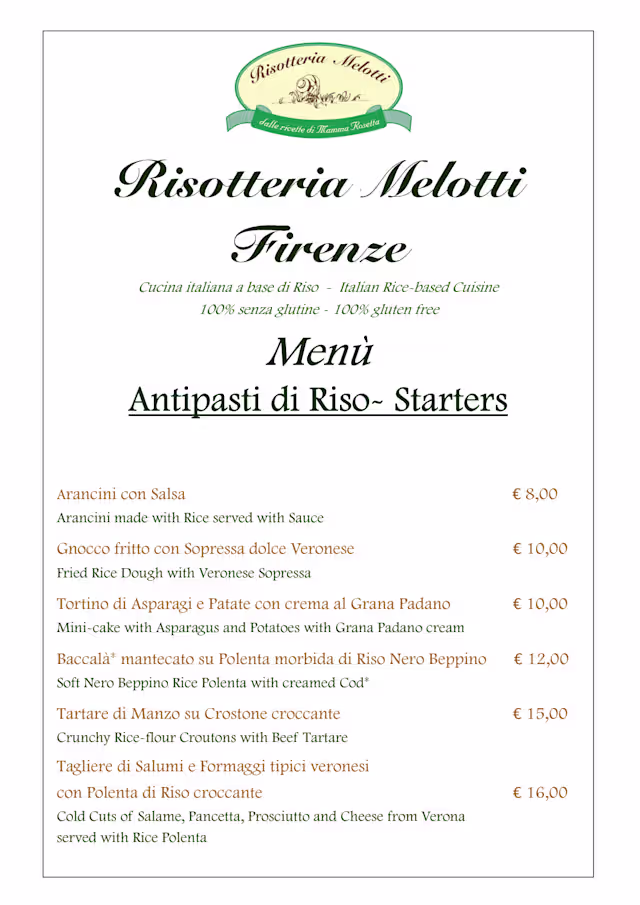 9.5/10Risotteria Melotti Firenze is 100% gluten free. One of our group of diners suffers from Coeliac Disease and it was such an easy and relaxing experience to enjoy a meal at a restaurant knowing that everything on the menu was gluten free. Reading the history of this family of rice growers from Vernona added to the connection with the concept of 'paddock to plate' by a family with a passion for the food prepared and served. Gluten free does not mean 'lacking in flavour' and this restaurant delivered well presented and flavoursome meals. Service was very good and the service staff communicated well with our group of English speakers from Australia. A thoroughly enjoyable evening.