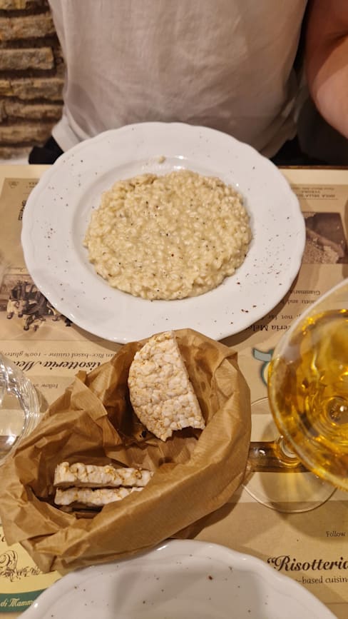 6/10I have been traveling in Europe for over 5 weeks. I've had some really amazing experiences at many different restaurants. As someone with celiac disease, my first and most important consideration is safety. Risotteria Melotti Roma totally achieved that. However, I found the service to be less than ideal. My waiter was impatient when I took a little while making up my mind. He forgot to serve me my first course, but rectified that. Basically, I found the service to be brusk and unkind. At the end, he asked for a tip.