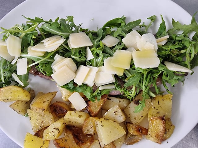 Tagliata di black angus argentino, rucola e parmigiano reggiano con patate al forno