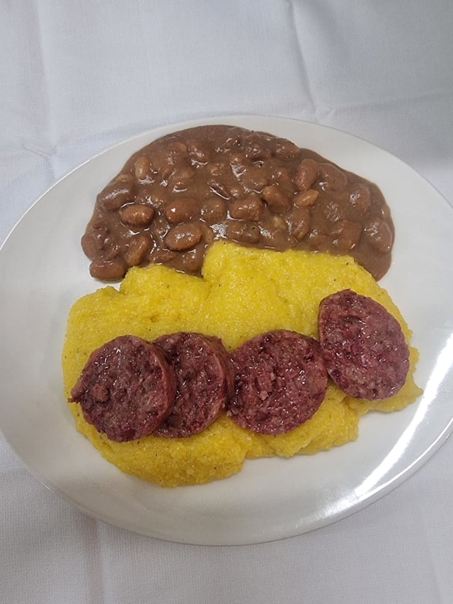 Cotechino servito su letto di polenta al cucchiaio con fagioli
