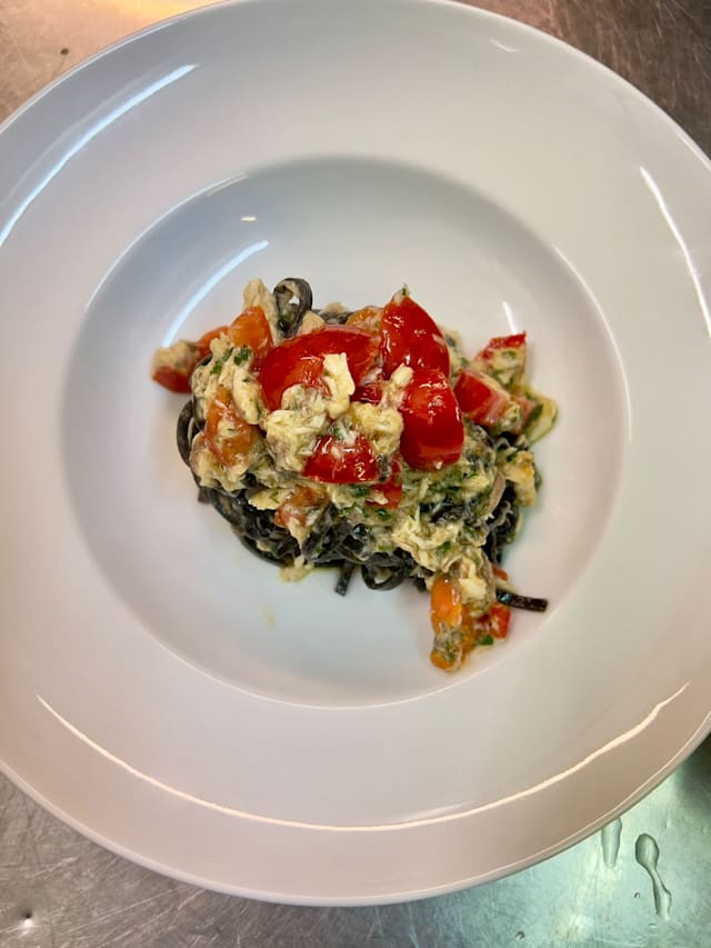 Spaghetti con crema di parmigiano, salmone e granella di pistacchio