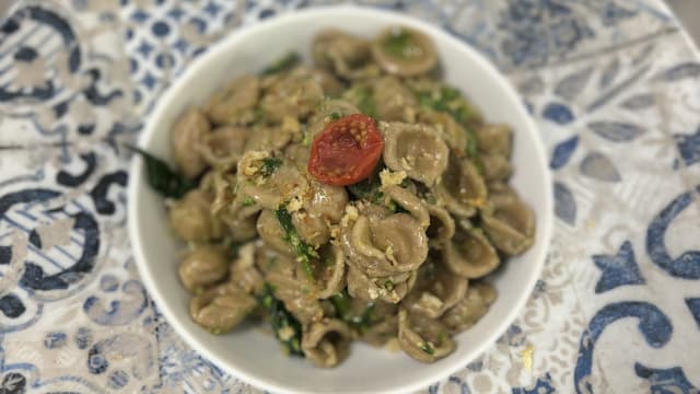 Orecchiette di grano arso con cimette di rape, acciuga e pane tostato