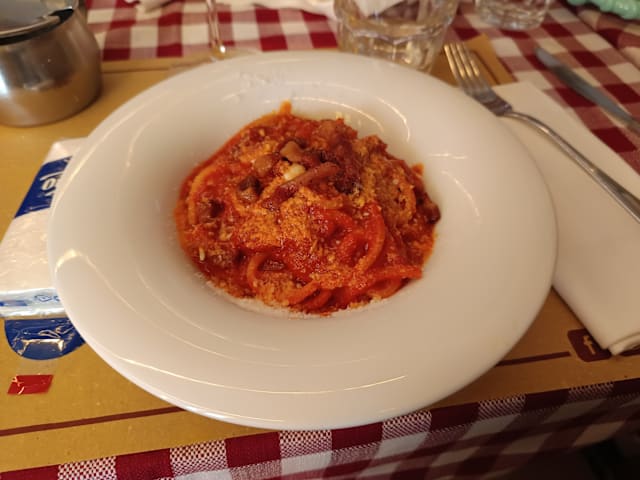 BUCATINI WITH BACON TOMATOES SAUCE AND PECORINO CHEESE