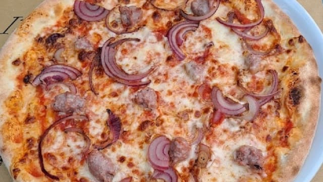 Pomodoro, mozzarella, salamino, cipolle, pancetta e peperoncino