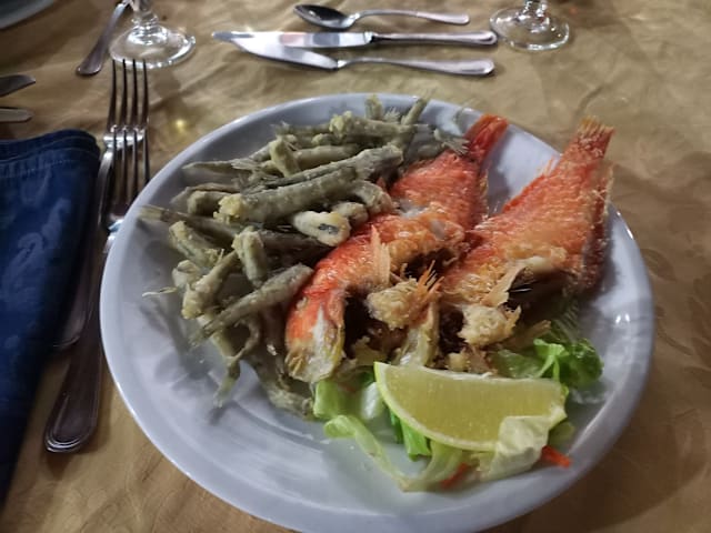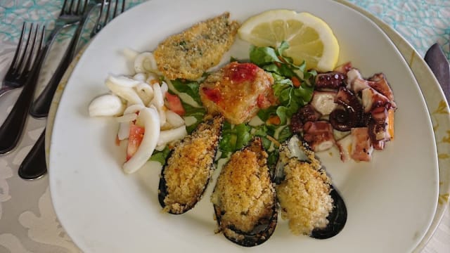 Totani al vapore con pomodorini, cozze gratin, alici a cotoletta fritti, cotoletta di spatola fritta e frittelle di fiori di zucca con gamberi