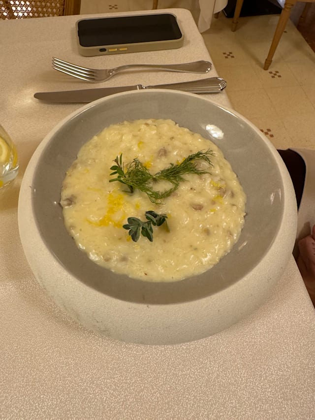 Risotto, pasta di salame, bagoss, rosmarino e profumo di limone