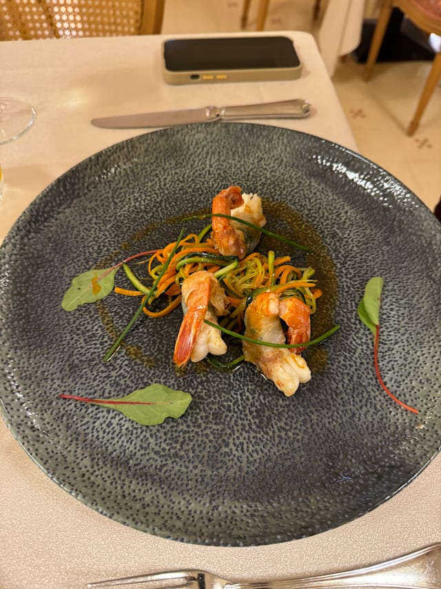 Fagottini di pasta all’uovo fritti, farciti con formaggio di capra, scampi, aceto balsamico e miele
