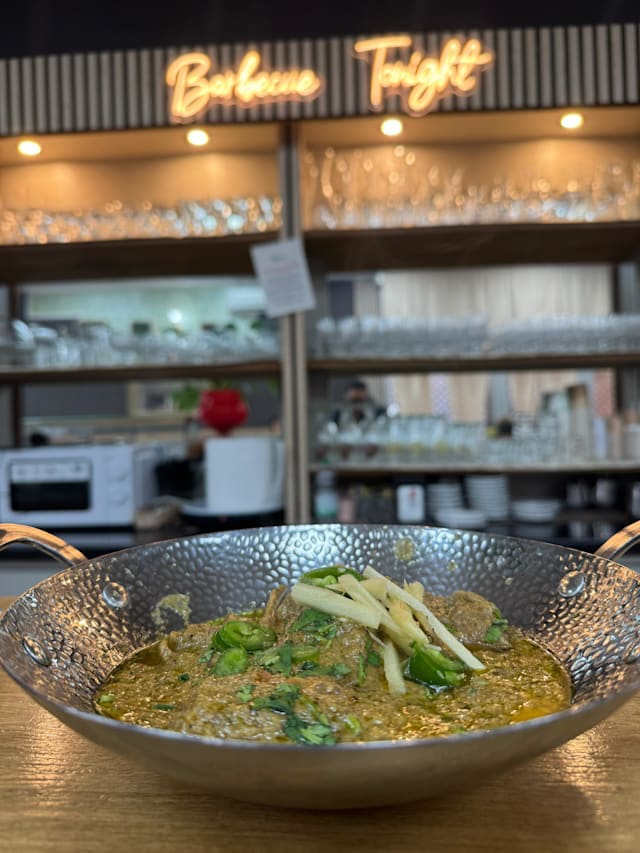 Carne di montone, pomodori, cipolla, aglio, zenzero, spezie (cumino, coriandolo, garam masala), peperoncino, cucinato in una wok (karahi) con olio