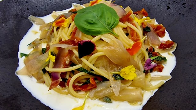 Filetto di branzino ai fiori di zucca e zucchine in tempura