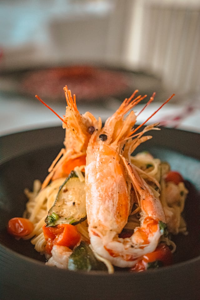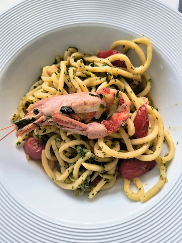 Troccoli "pasta fresca" saltati con gamberi, zucchine e pomodorini pachino