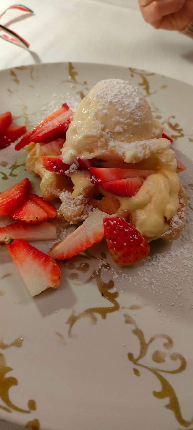 - Cialda belga tiepida con pasticcera, gelato artigianale alla crema e fragole fresche