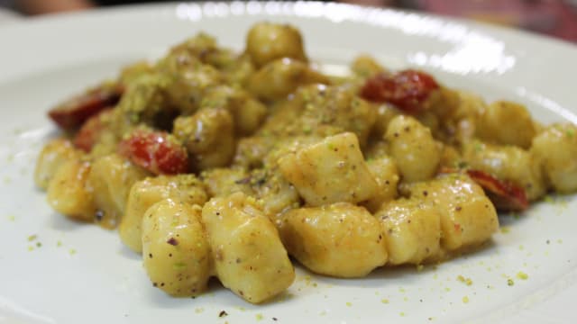 - Gnocchi di patate con rapa rossa, formaggio affinato mons e mandorle tostate