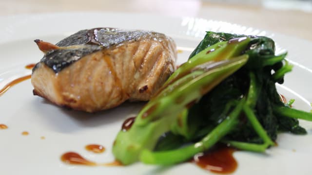 - Filetto di orata con rapa rossa, cime di rapa saltata e salsa bernese