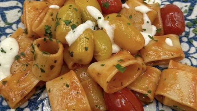 Pomodoro, olio all' aglio, origano, olive nere, accughe, olio evo