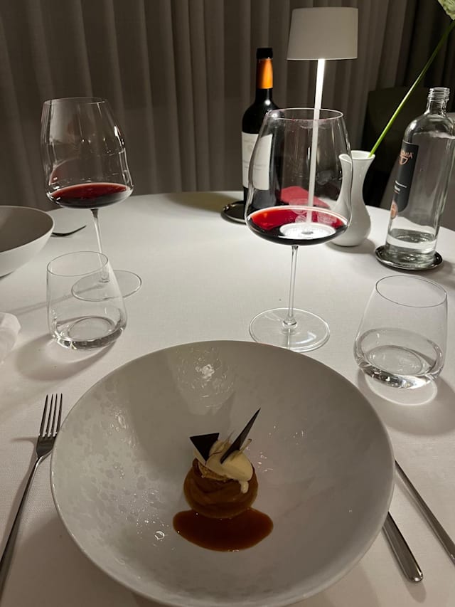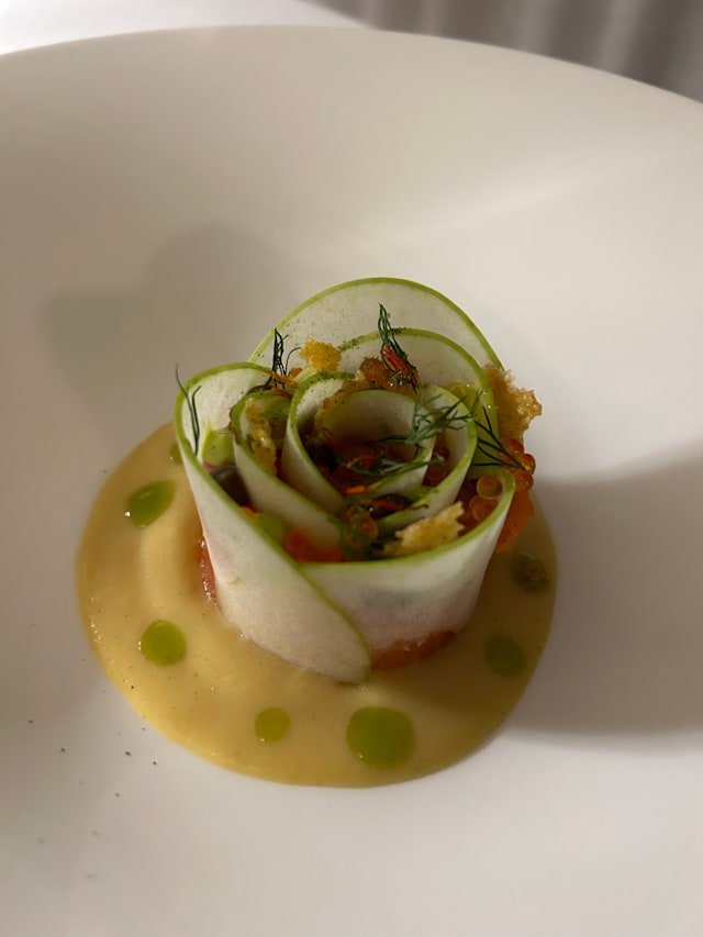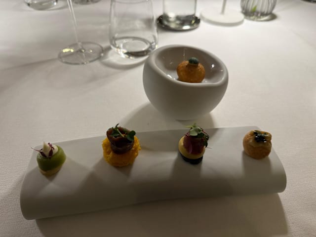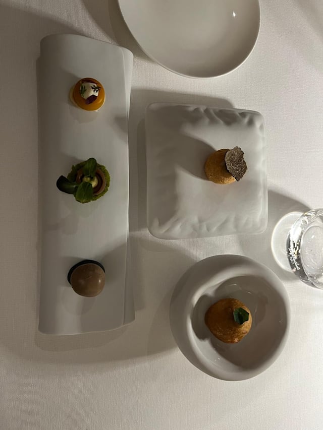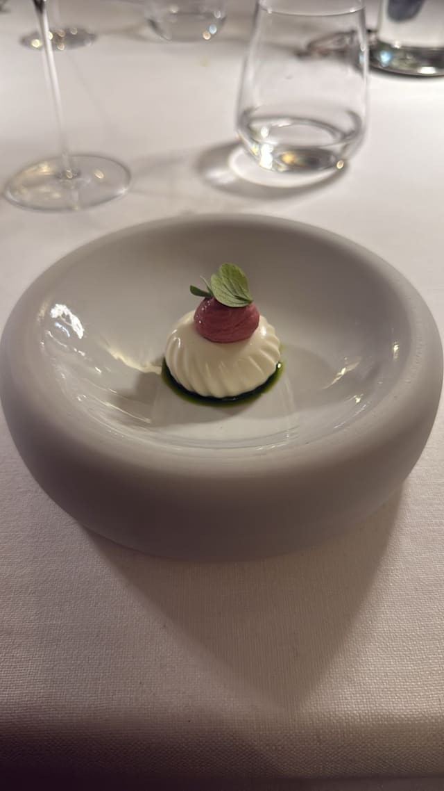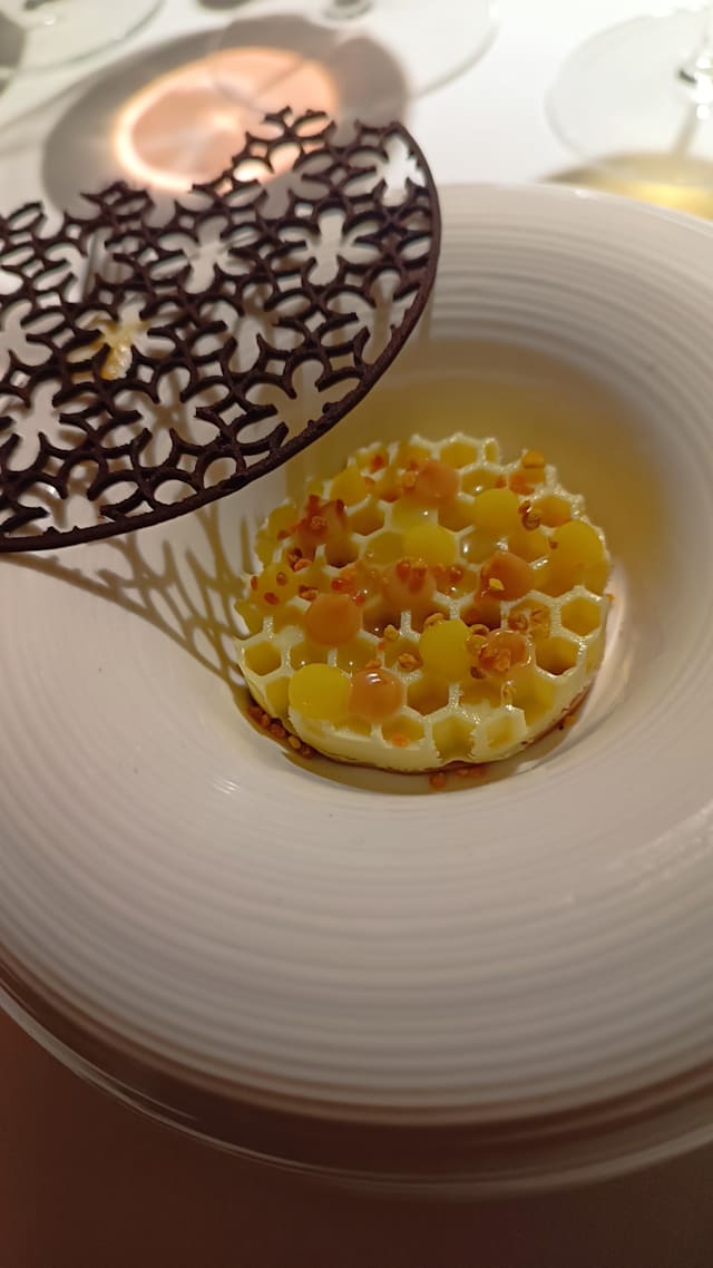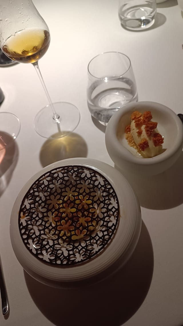 Risotto mantecato con crema di zucca, burro acido e parmigiano reggiano, salsa di taro,polvere di kombava, animella glassata, jus di vitello, foglia ostrica, cheriboshi e gel di kumquat