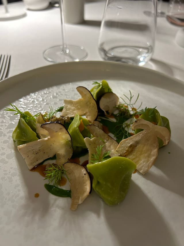 Ravioli al caffè ripieni di lepre, fondo di lepre al cioccolato fondente, fonduta di Montasio, crema di cavolo nero, daikon in osmosi di lamponi e tartufo nero