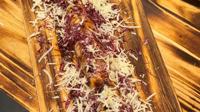 - Baguette francese rivisitata farcita con mozzarella di fior di latte, caciocavallo della sila, speck, pepe nero, guarnita con insalata trevisana e olio extravergine di oliva.