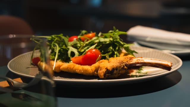 Cotoletta alla milanese con pomodorini e rucola e patatine fritte