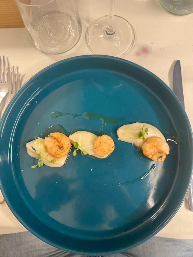 Ravioli di Granchio con Pesto di Lattuga e Bisque di Gamberi in due consistenze