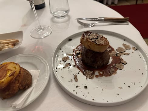 8.5/10Hidden away but worth the visit. We were very late for our reservation but it wasn't as busy as the cafe upstairs. We ordered the snails, the agnotti pasta and the Rossini and foie gras. The snails were a little salty for our liking but both the pasta and the Rossini were excellent quality. Not the cheapest lunch but the service is good as is the food.