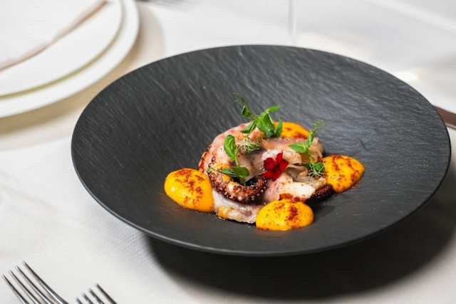 - Polpo arrosticciato con spuma al basilico e jullien di verdure