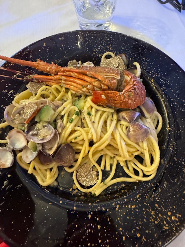 Tagliatelle con aragostella, zucchine, vongole e tartufo nero