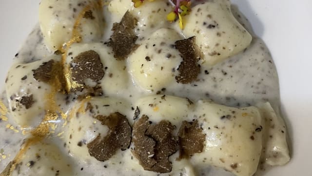 Gnocco ripieno di caciotta su sottobosco e noci