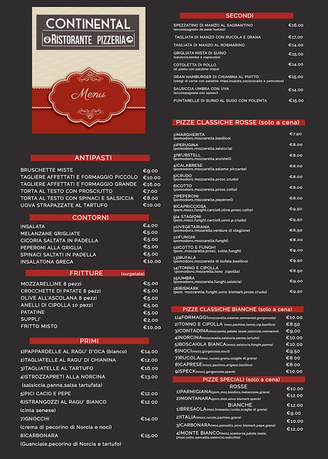 5.5/10Continental is a small restaurant and pizzeria in the heart of Perugia old city. It offers a quite varied menu and we tried appetizers and pizzas. The quality of food is just acceptable but not worth a second visit. Service is very kind and friendly but the setting is rather shabby. Prices are relatively cheap.