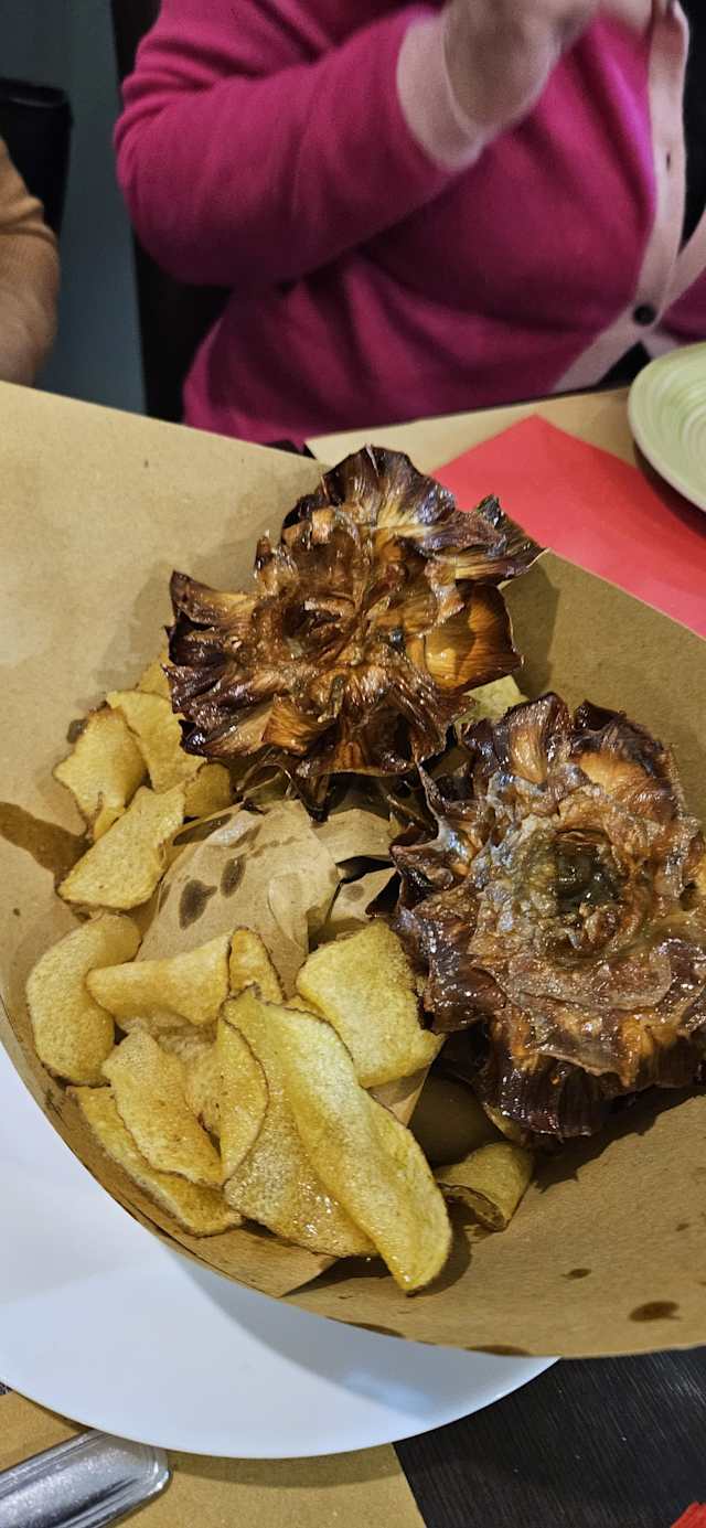 - Carciofo alla giudea, suppli, un velo di patate, fiori di zucca e crocchetta di patate
