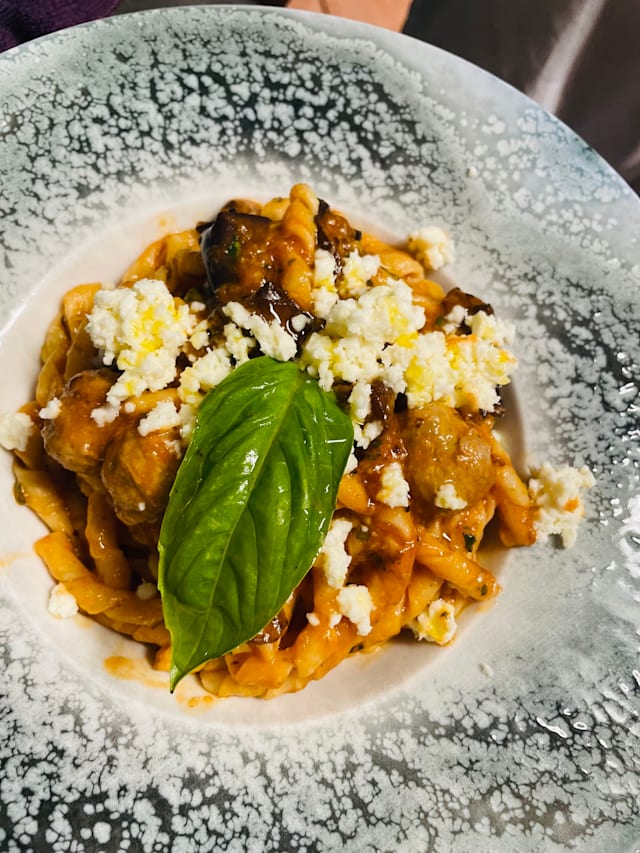 - (Tonno*abbattuto, melanzane fritte, pomodoro fresco, menta, salsa di pomodoro, olio evo, aglio, pepe nero, prezzemolo, sale)